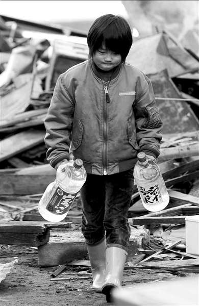 14日,一名男孩拿着瓶装水穿过废墟。图/人民图片