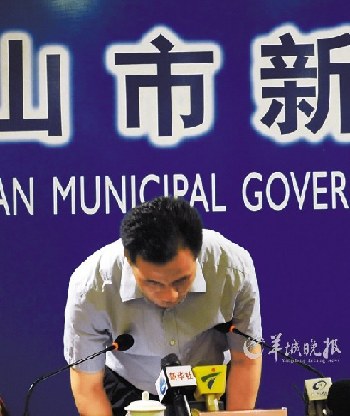 会上,人社局副局长公开向社会鞠躬道歉(右图)。