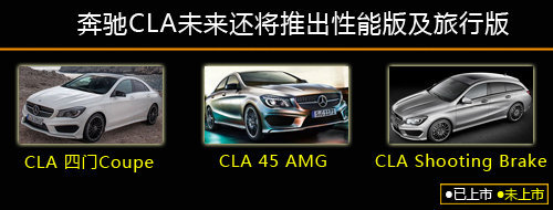 奔驰CLA除标准版车型外,此前还计划推出性能版CLA 45 AMG以及猎装版CLA Shooting Brake,这两款车型均有望于在今年四月的纽约车展上进行全球首发。其中CLA 45 AMG有望搭载一台2.0升四缸涡轮增压发动机,该动力系统在经过调校后将拥有高达265KW的最大功率以及450N·m的峰值扭矩,并匹配7速双离合变速箱,而后者则将搭载与普通版相同的动力总成,同时也将提供4MATIC四驱系统。